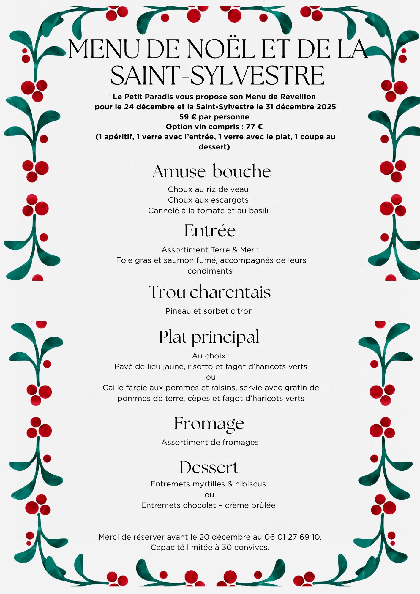 Sonia et Christophe vous accueillent avec un menu spécial Noël et Saint-Sylvestre.